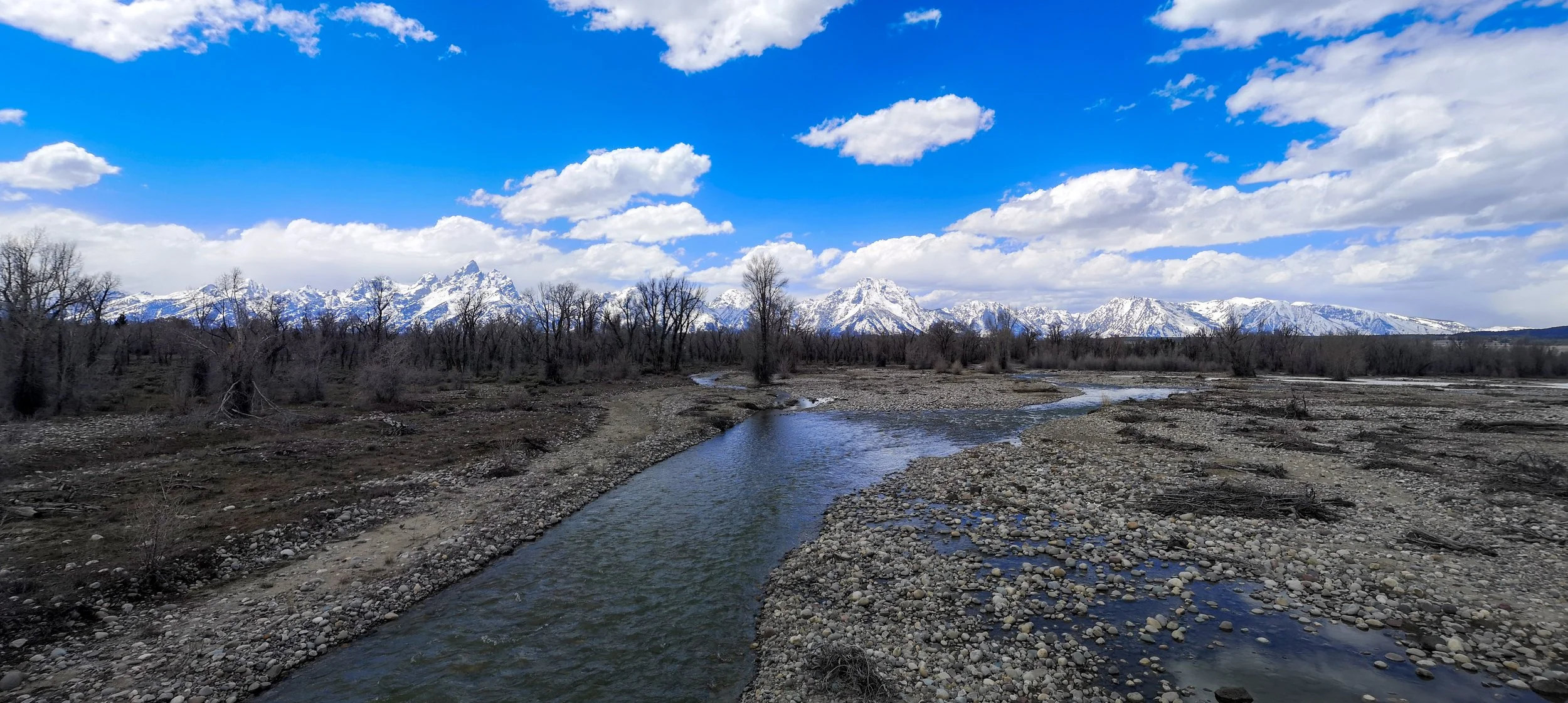 The forecast was for a cool day with a high chance of snow. There was certainly deep snow all around and we were worried about spending two nights at a tent-only basic campsite. We debated what to do but as the day progressed the sun came out and we decided to stick with the plan. Once over the pass we had a 17-mile descent, fantastic but oh so cold. The views were mind blowing though! At the bottom of the pass, we popped into a ranger station to warm up. The cheerful ranger casually mentioned that we would shortly be seeing Grizzly Bear, a mum and her two cubs were half a mile ahead! Sure enough within minutes we saw parked cars, a sure sign of an animal sighting. Another ranger flagged us down, gave us advice about keeping safe, basically do not get too close, as if! The Grizzles were great, mum munching away on grass and the two cubs rolling around and generally putting on a great show for us fans. It was a fantastic sight and also very reassuring. Feeling much more confident we headed towards the Grand Tetons.