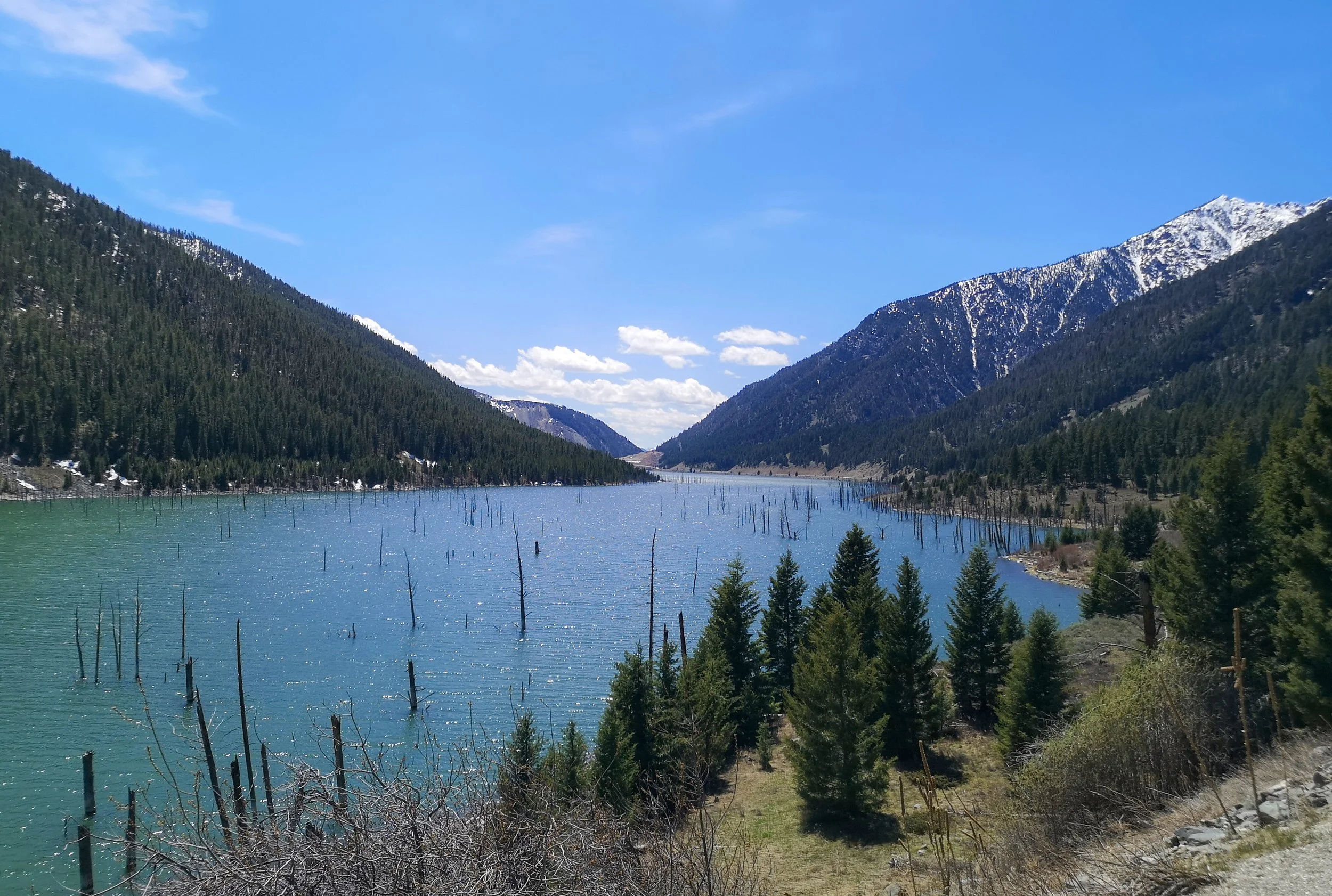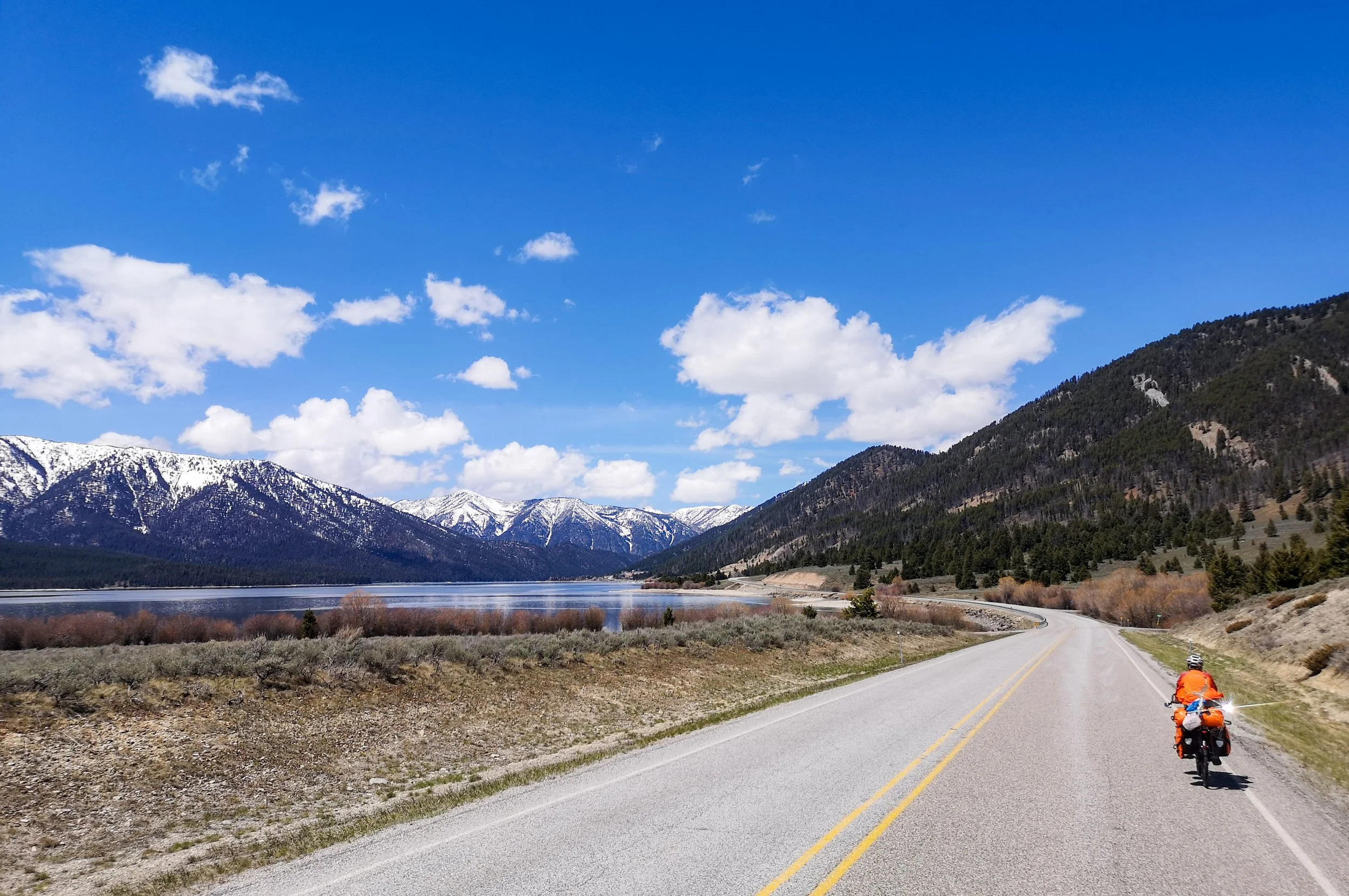Montana was calling us on. Immediately the landscape changed. Gone were the geysers and forest lined hills. Now we had snow-capped mountains and the stunning Madison river and lakes to ride by.