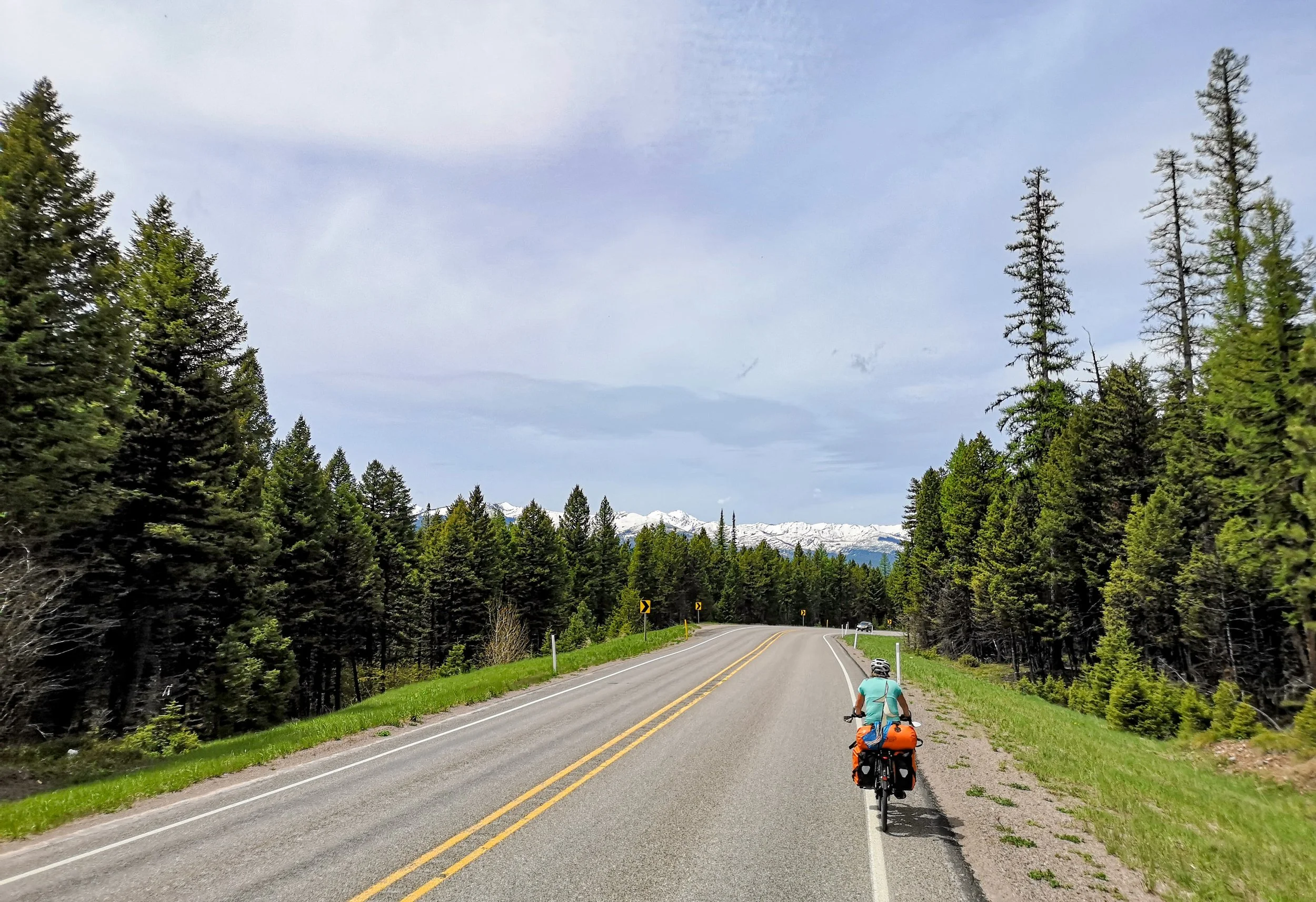 Both somewhat tired we set off in shorts and t-shirt for the first time since Breckenridge. It was warm! The riding was easy but a fair few ups after the downs. We stopped at renovated church to eat our lunch, Kevin, a FedEx driver pulled in to check we were OK and inform us that the two girls heading to Alaska were just a day ahead of us. We may yet get to meet them! Time was getting on and we still had 35 miles to go so off we went. We had barely got going when Tom spotted some Ortlieb panniers and shouted ‘tourer’. We pulled over to the store cum café, no scones with clotted cream though, and got chatting to Rich of overlandscooter.com. He is touring on an electric scooter which hauls his trailer whilst whizzing along at speeds of up to 40 miles an hour. Now that’s an idea!