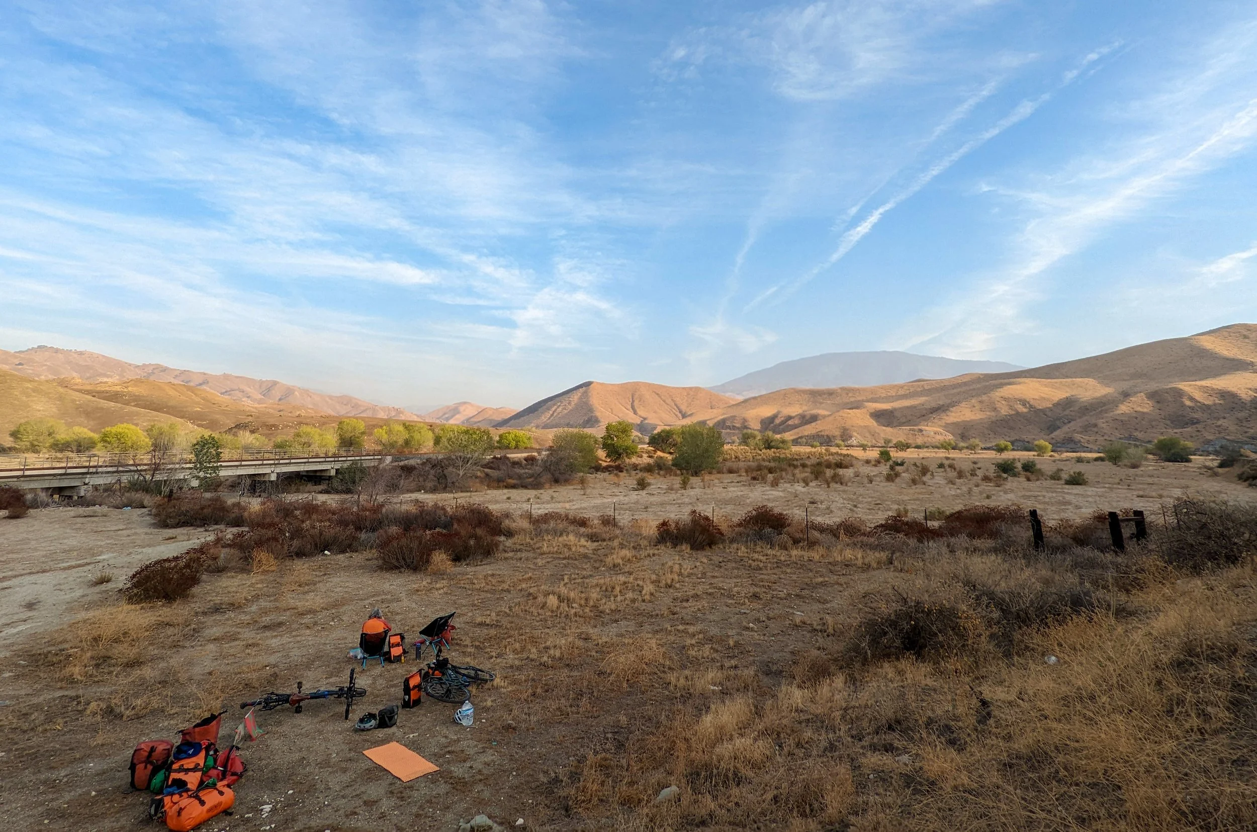 Finally as we rode away from Bakersfield the scenery improved and our mood lifted. Slowly we left behind the miles of litter-strewn roadsides, run-down neighbourhoods and got out into the foothills of the approaching mountains. Tom had a wild-camp spot in mind and around 4pm after 70+ miles we got there. Just out of sight of the few cars that were passing it seemed perfect. We were very close to the railway line but doubted there would be many trains and settled down for the night.