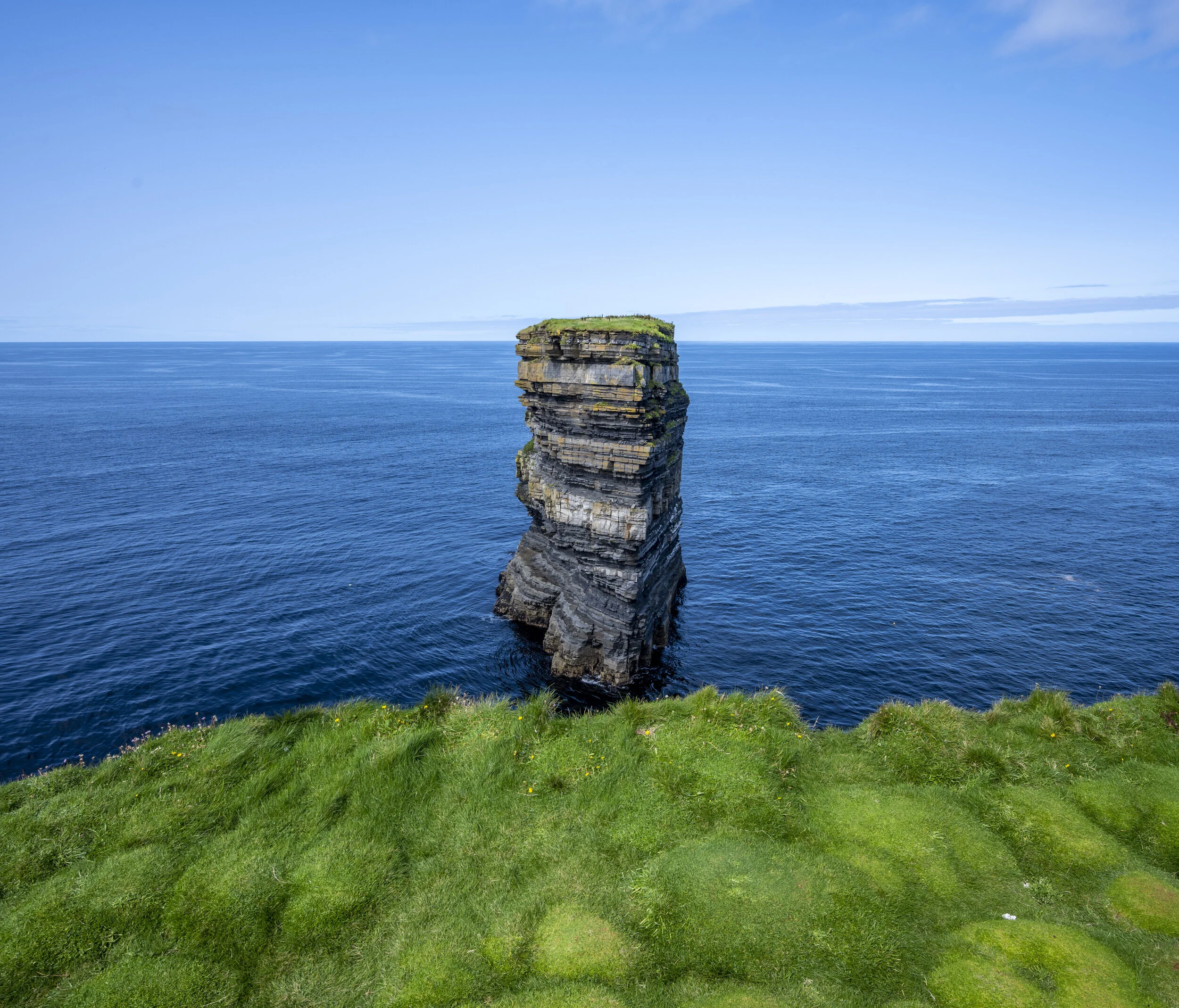 We parted company after looking at a Round Tower in Killala. We just needed Rapunzel and a Knight in shining armour! We took a back to the coast, saw where the French had landed in 1789 to assist the Irish in a doomed rebellion against the English. Then we rode to Downpatrick Head. A stunning sea stack, blow holes and endless tales of St Patrick. He either banished all the snakes onto a tip of land, or the local war lord who refused to convert to Christianity, or one of many other tales, snapped off the land and left the snakes, war lord etc. to their fate! There is also a sign carved into the grass which warned airmen in WW2 that they were flying over neutral territory. Clearly this also was a pretty useful navigation aid to said airmen, thanks Ireland.