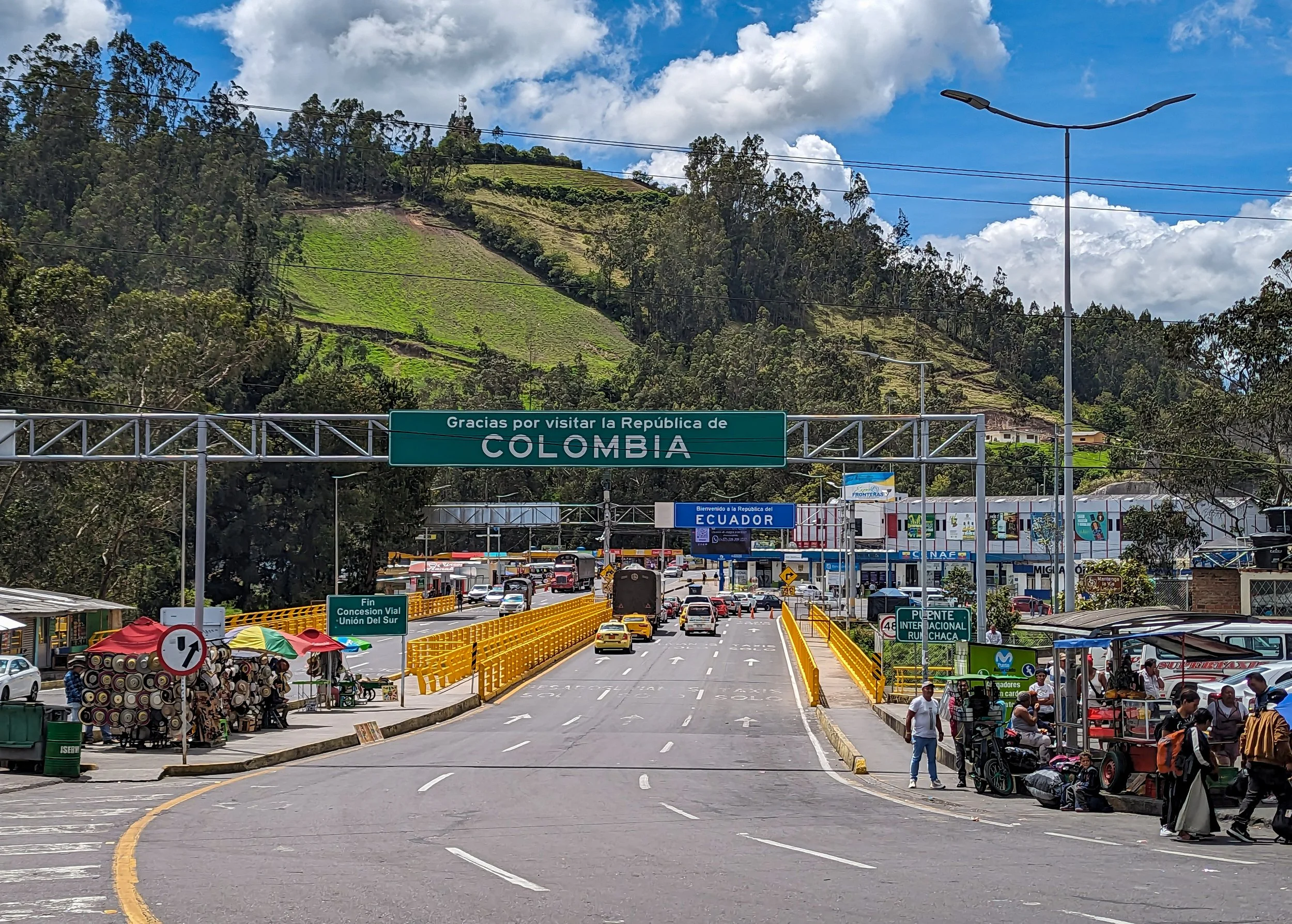 So long folks! After one last climb from our hotel just above the church at Las Lajas and unbelievably a few flat and downhill miles, we reached the border between Colombia and Ecuador. With the aid of the quite frankly super-friendly money changers, we headed into the Colombian customs office to get our exit stamp. A few minutes queuing and we were off. Unfortunately not into Ecuador, but to an office on the first floor, then an interview room on the second floor. We weren’t getting an exit stamp just yet! The customs officer had spotted that we had originally entered Columbia in February but had not noticed we had left in April and re-entered late September. Despite us pointing this out, the customs officer wasn’t backing down. A woman officer, who managed not to look at us, never mind listen to us, printed out what we assumed was a fine for overstaying and after being ignored for a bit longer we were sent upstairs again. After lots more hanging about and us harassing various customs officers, finally someone went to chase it up. A few minutes later Mrs Miserable eventually handed us our stamped passports and in answer to our question what had gone wrong and taken so long (2 hours at least) with a grimace she finally spoke, “Nothing” and waved us away!